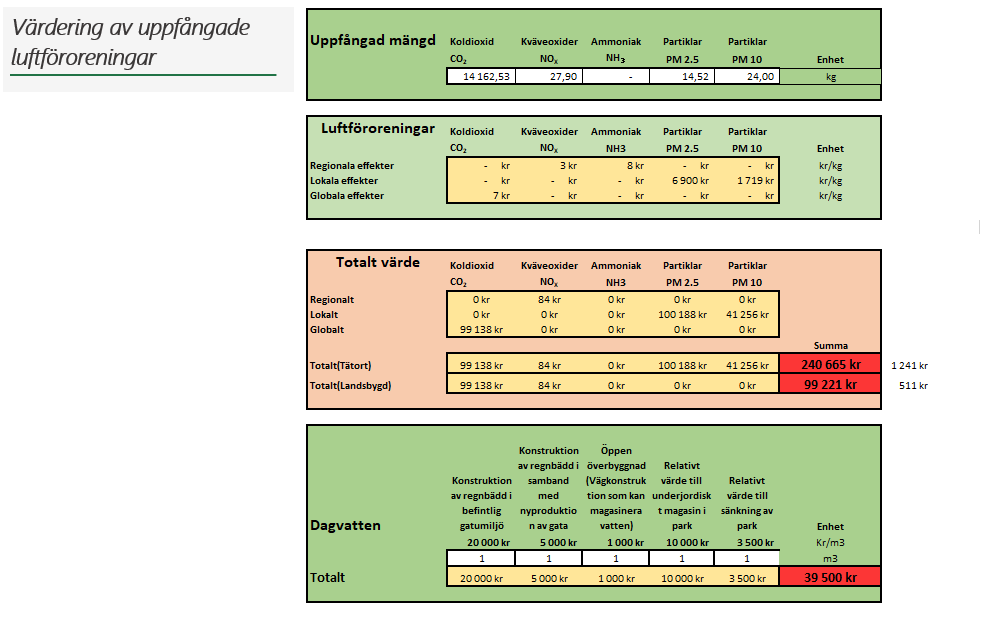 Beskrivning: Översättning av i-Tree Eco värden till svenska monitära värden.
